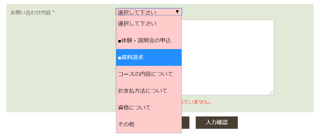 そして、お問い合わせ内容の欄に、『資料請求(無料です)』を選択する項目がありますので、選択してください。